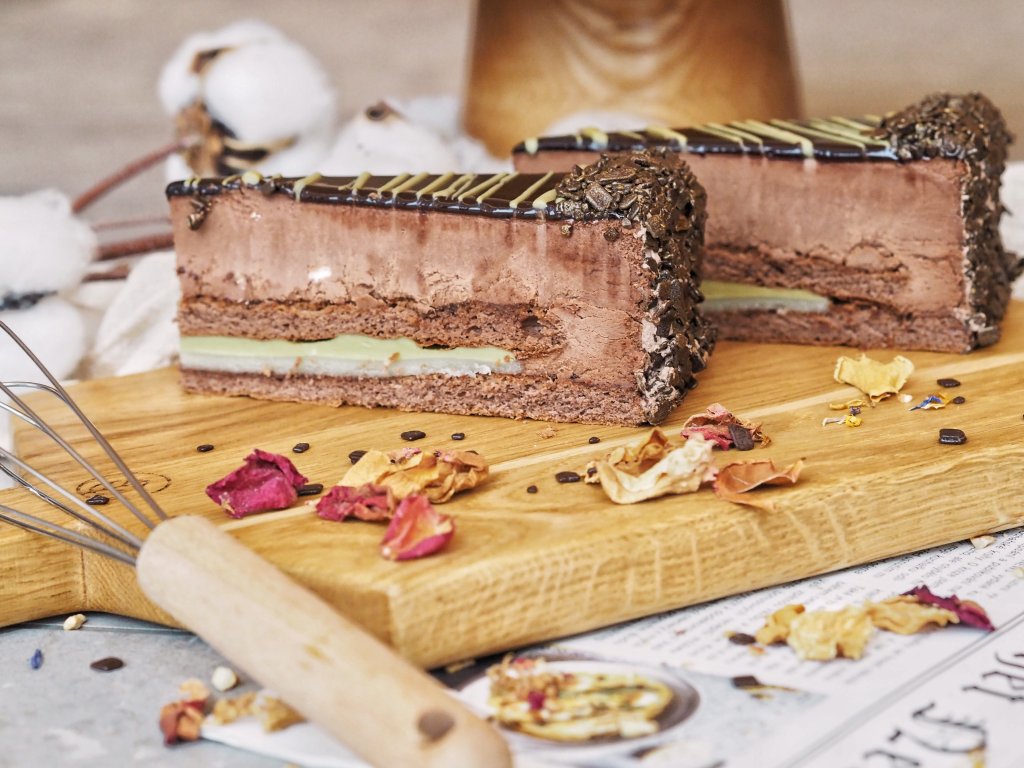 Čokoládový zákusek jedinečné chuti, hořká belgická čokoláda se skvěle chuťově doplňuje s pistácií a marcipánem.