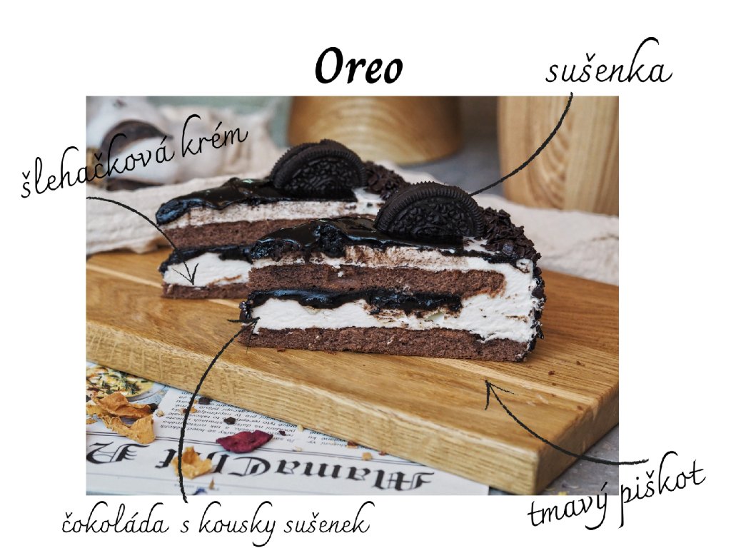 Dort Oreo je složen z čokoládového piškotu, šlehačkového krému a čokolády obsahující kousky sušenek.