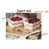 Zákusek Jogurt mix je složen ze světlého piškotu, jogurtového krému a ovocnou směsí zalitou v želé jako je černý a červený rybíz, mandarinka, broskev.